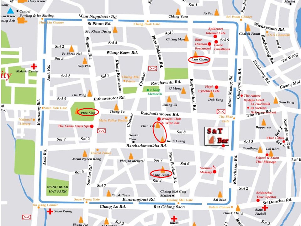 Plan du centre de Chiang Mai avec indication des temples visités (sauf Wat Suthep)