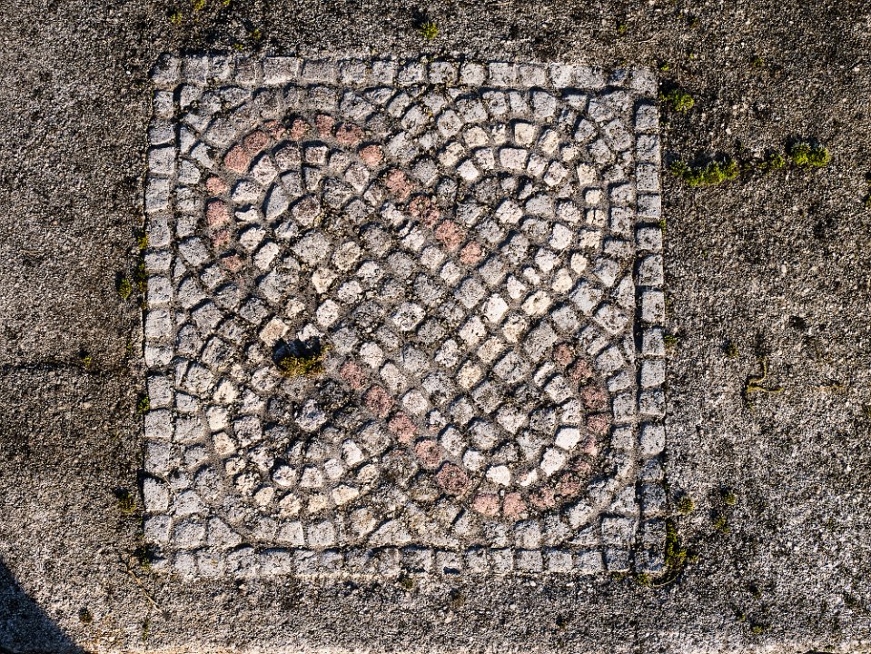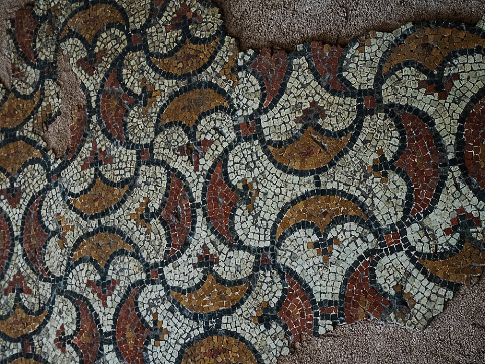 Mosaïque à l'entrée des thermes (décor de boucliers)