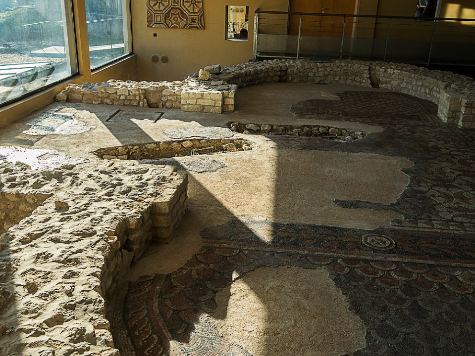 Vestiges des mosaïques de la grande salle à abside, sous une verrière- gelée!