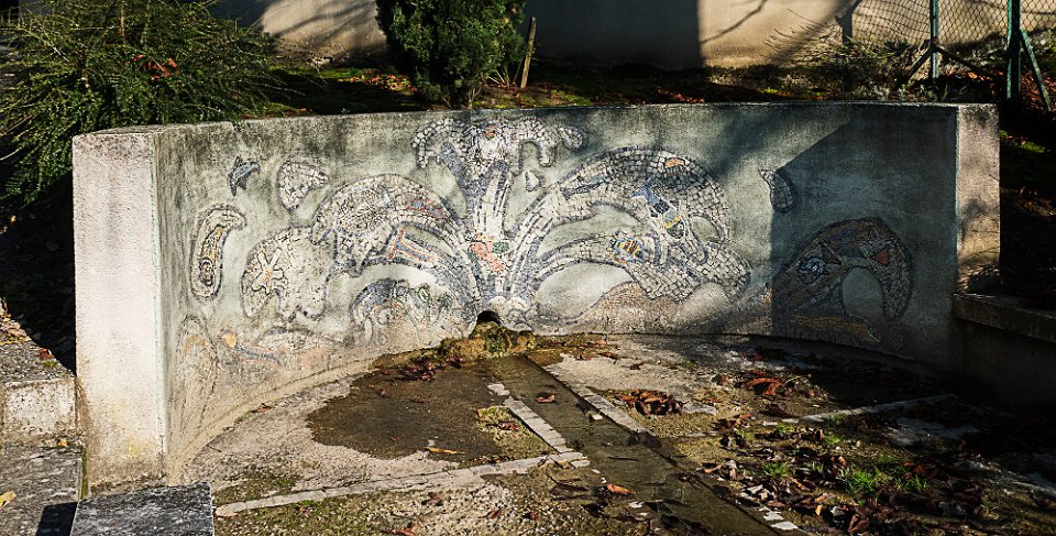 Détail des mosaïques de la piscine et pierre plate sur laquelle chutait l'eau