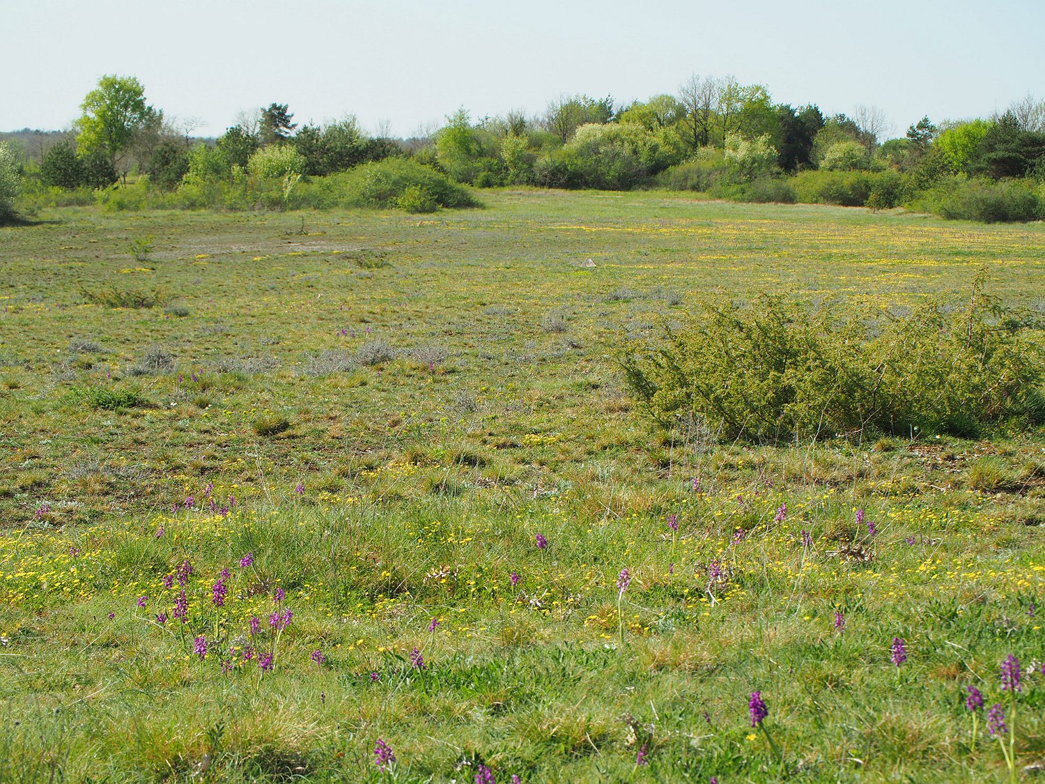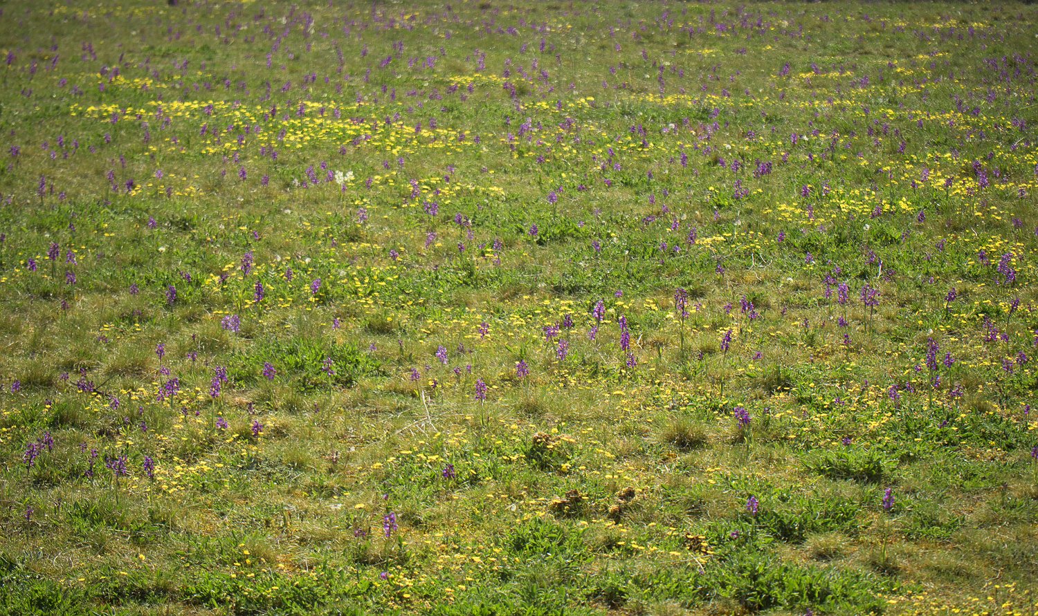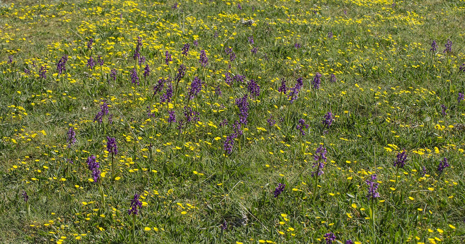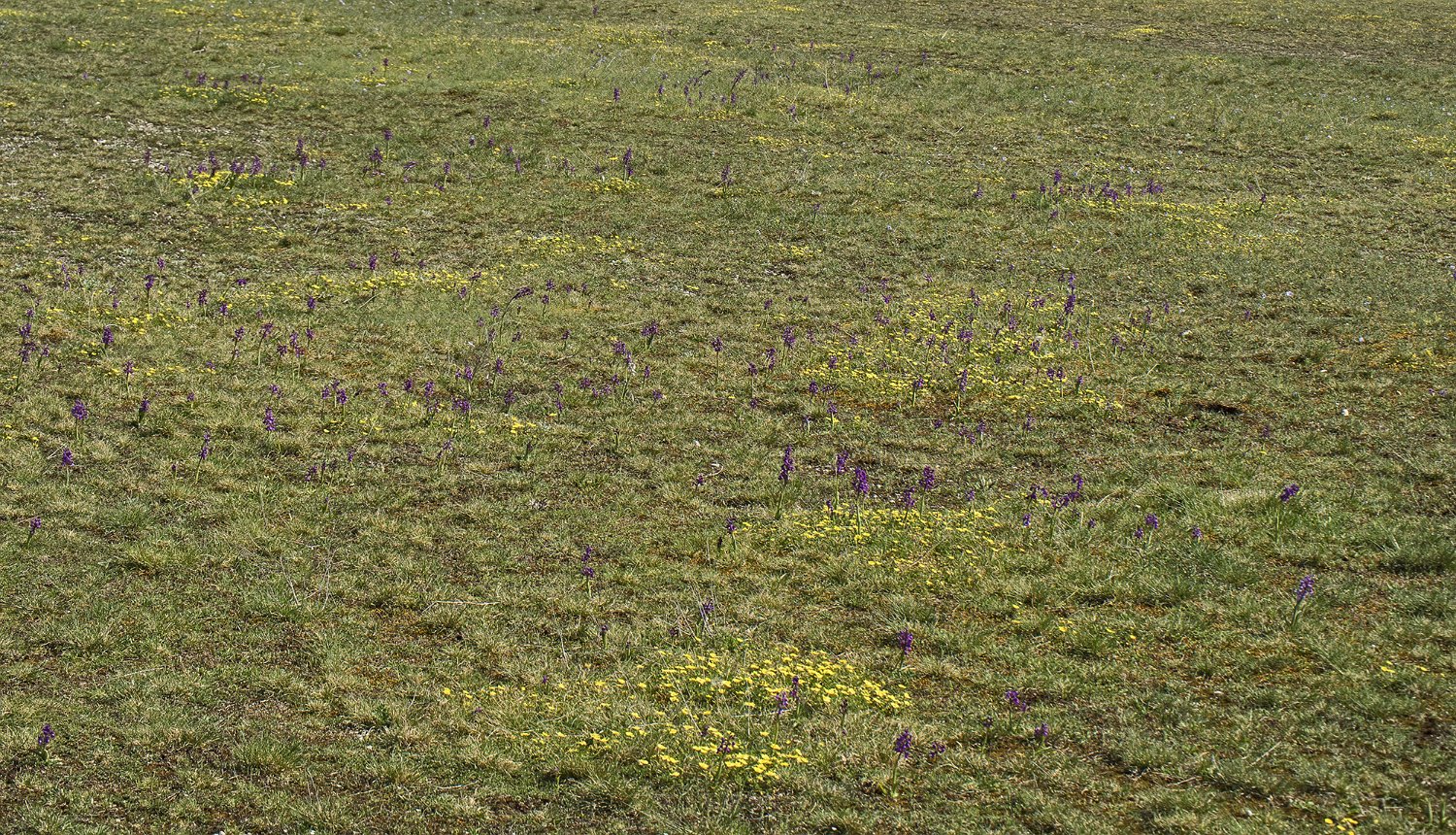 Aspect de la pelouse fleurie au printemps Peuplement d'orchydées Fumana couché (Fumana procumbes)  Plante inféodée aux pelouses sèches et rochers calcaires Orchis bouffon  (Anacamptis morio)