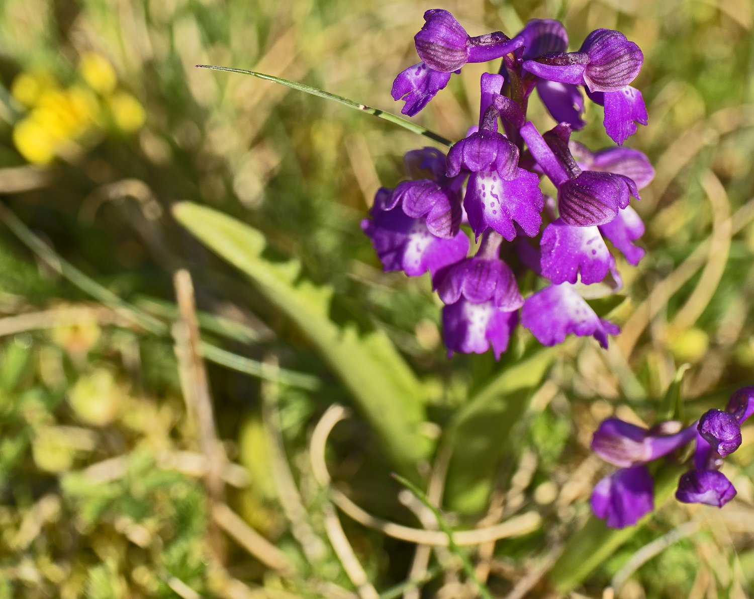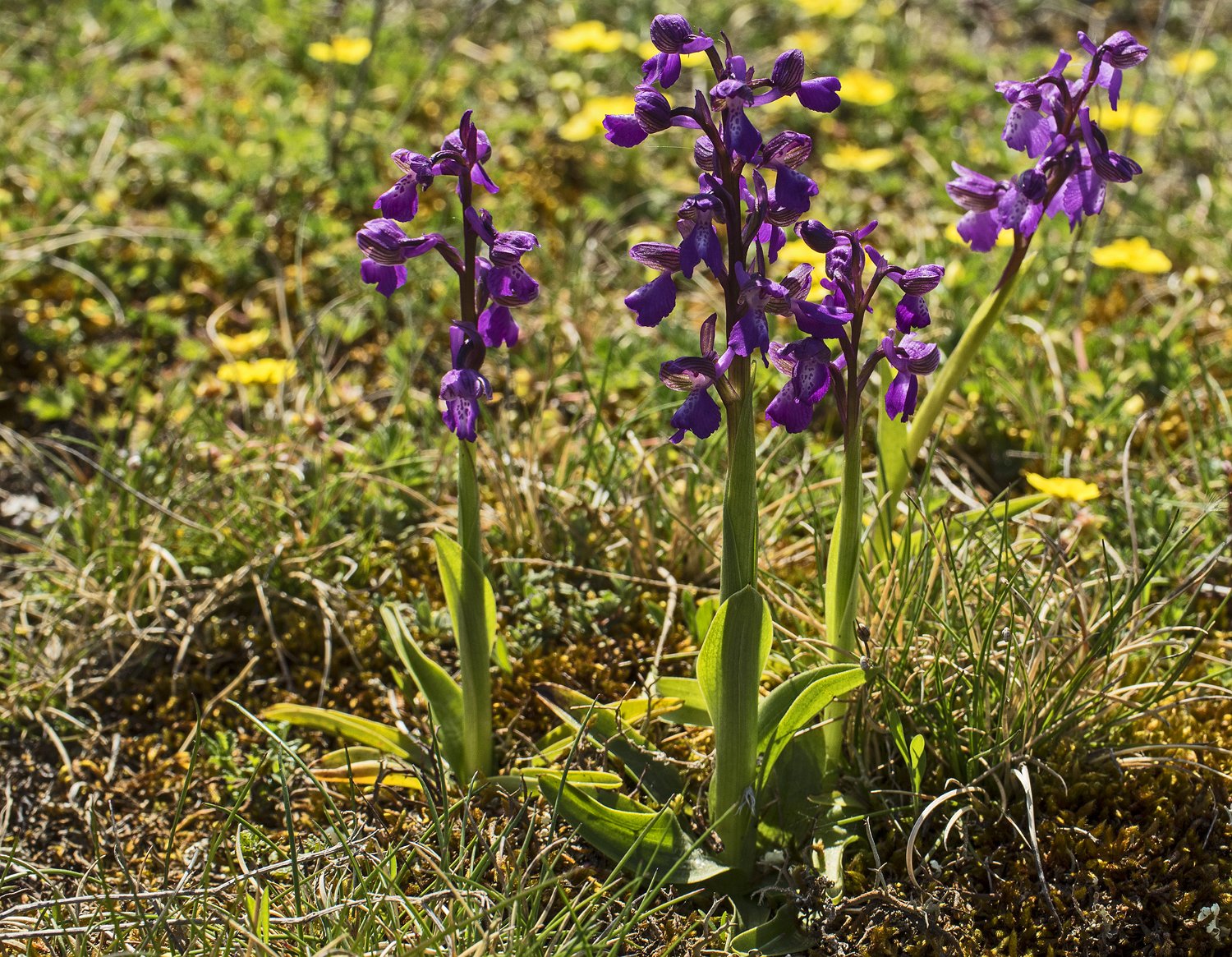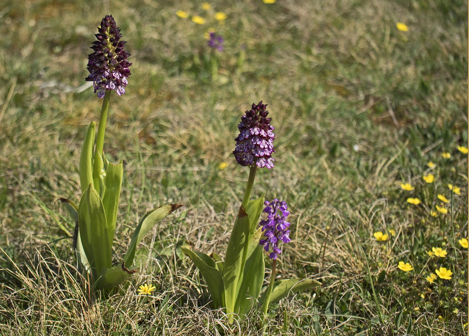 Aspect de la pelouse fleurie au printemps Peuplement d'orchydées Fumana couché (Fumana procumbes)  Plante inféodée aux pelouses sèches et rochers calcaires Orchis bouffon  (Anacamptis morio)