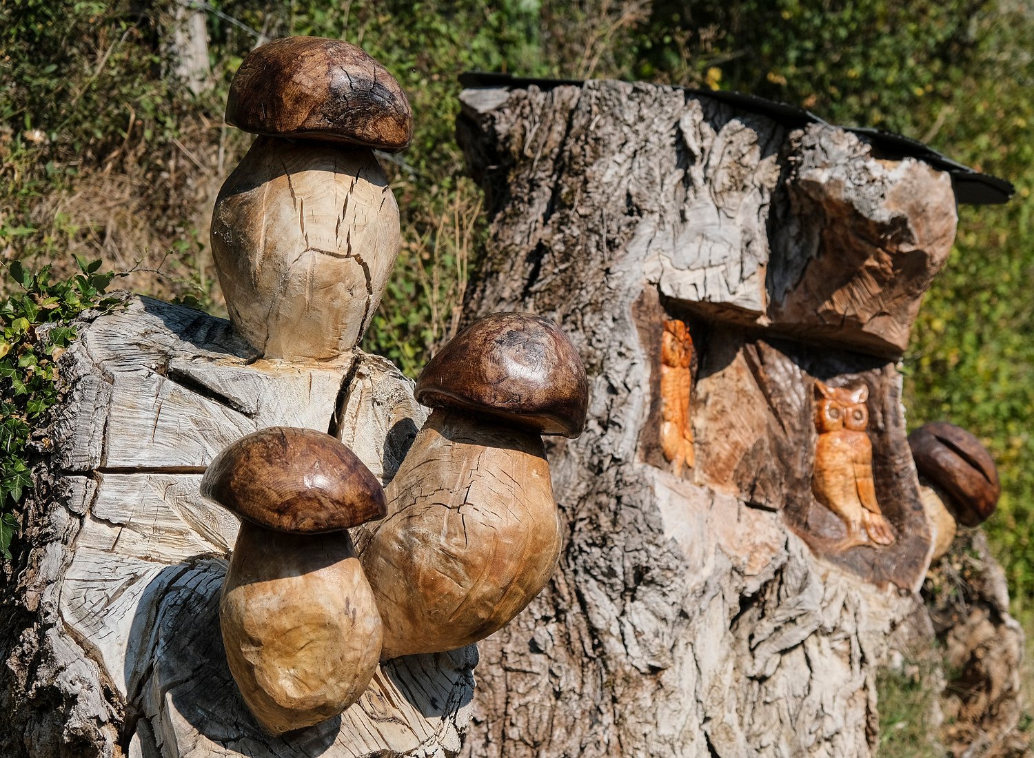 Scultures sur tronc en place à l'entrée du village