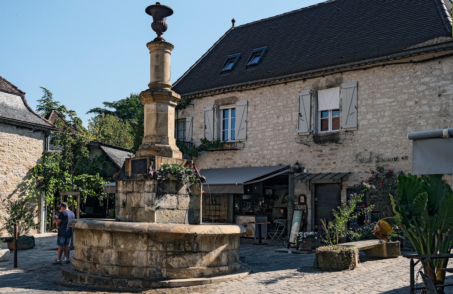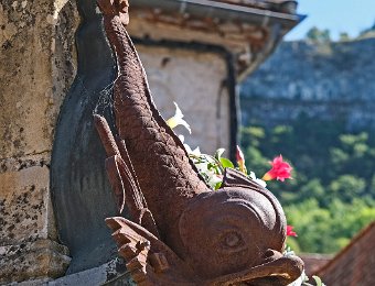 La fontaine du centre du village ornée de dauphins de broze
