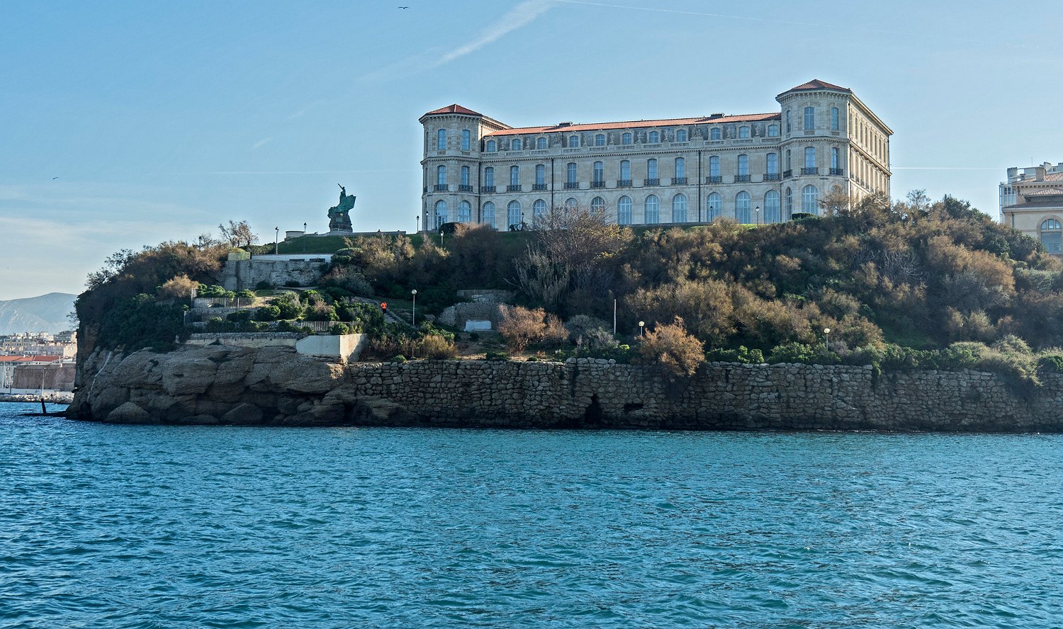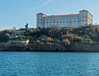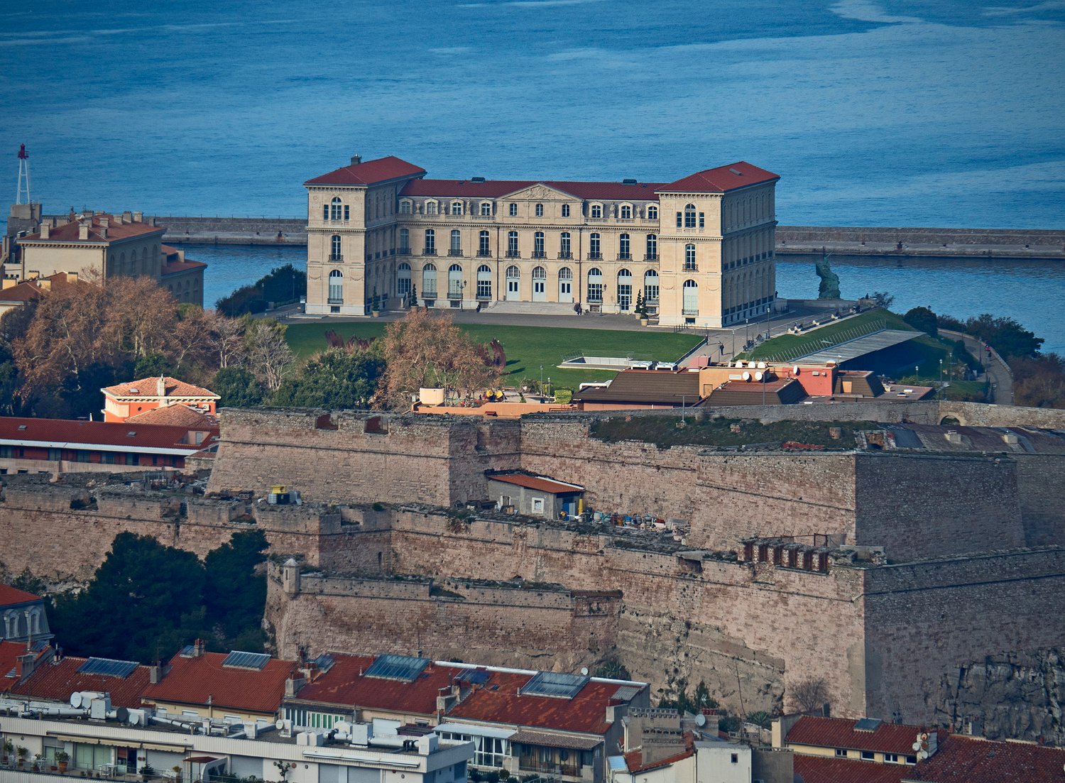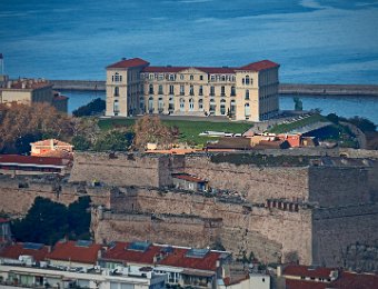 Palais du Faro, façade côté terre. Au premier plan le fort d'Entrecasteaux (partie haute du fort Saint Nicolas)