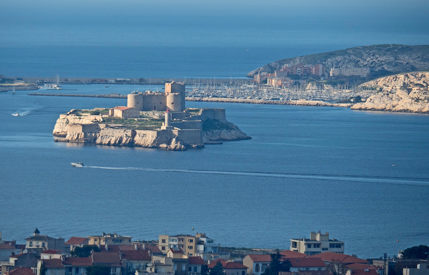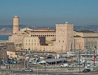 Les deux forts de défense de l'entrée du vieux port vus depuis le point de vue de l'Abbaye Saint Victor : à droite le fort Saint Jean et à gauche le fort Saint Nicolas