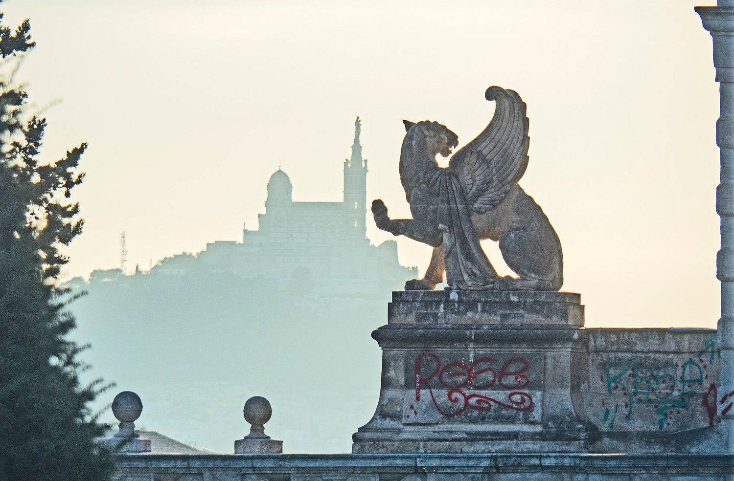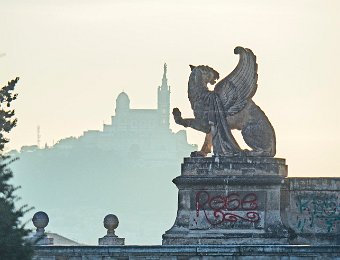 Palais Longchamp - Statue sur fond de Notre Dame de la Garde