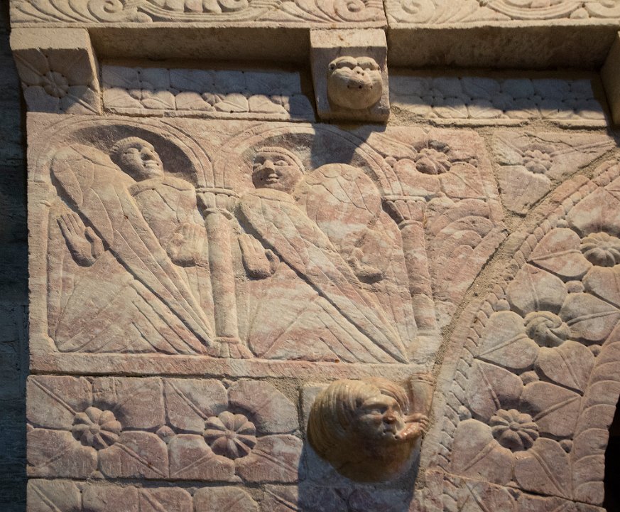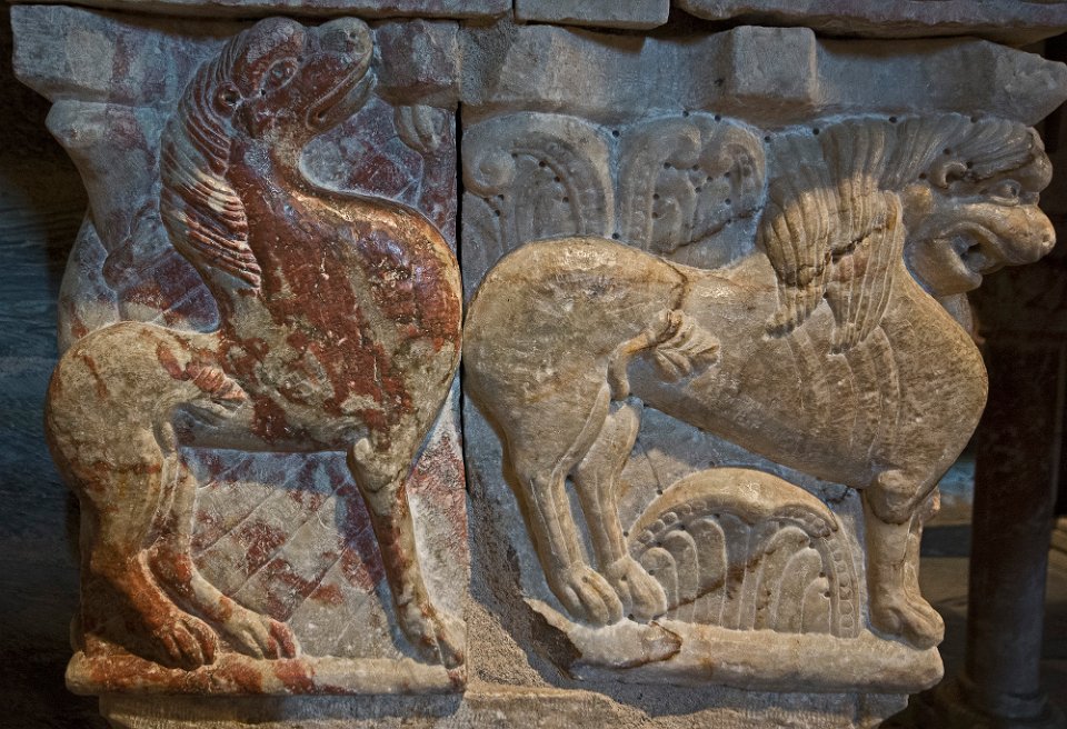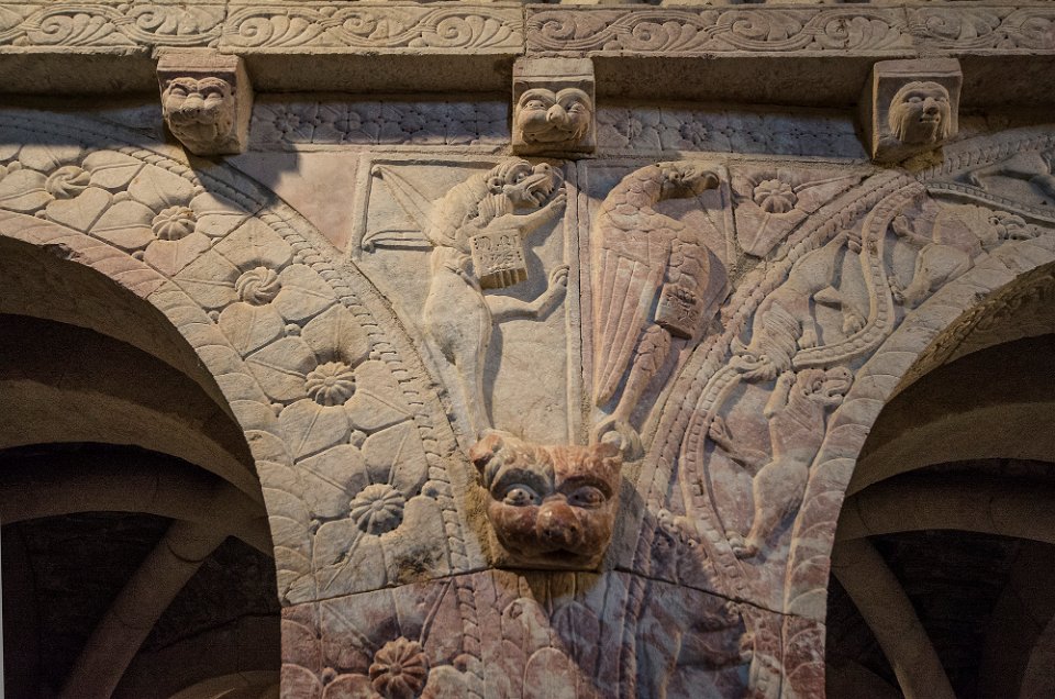 Sculpture sur un pilastre de la tribune  Anges à 3 paires d'ailes Sculpture de la tribune Sculpure de la tribune  Le lion de St Marc portant le livre où son nom est gravé MARCVS et l'aigle de St Jean avec le livre portant son nom : IOHANNES Chapiteau d'une colonne de la tribune