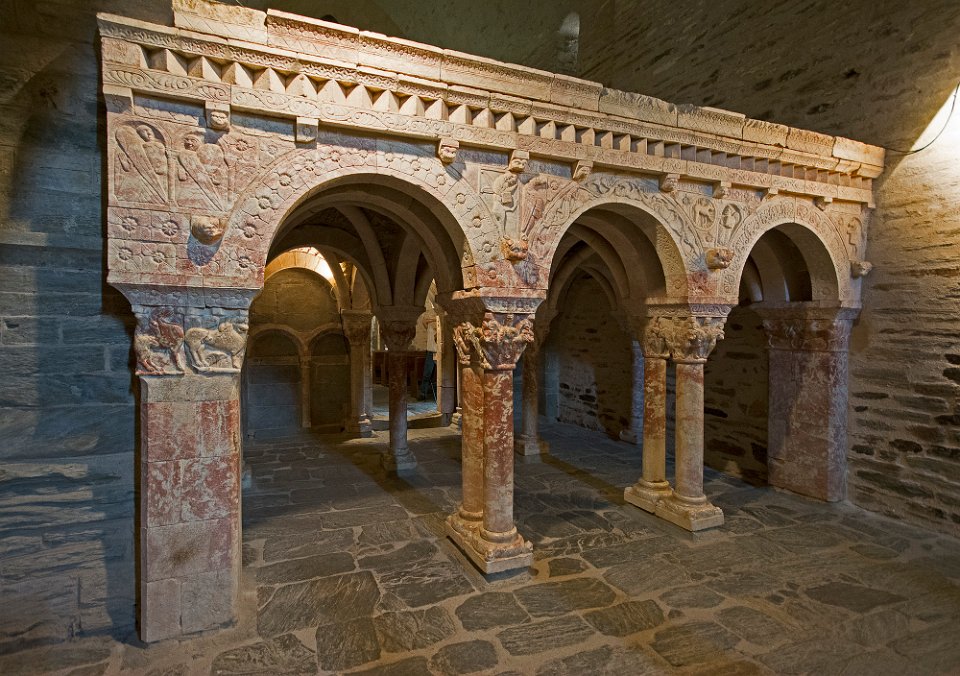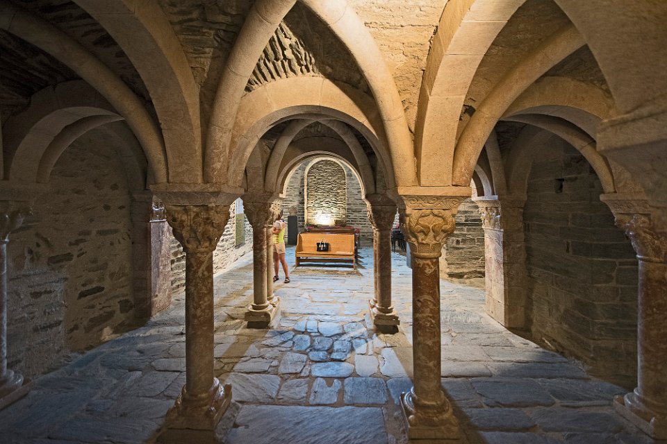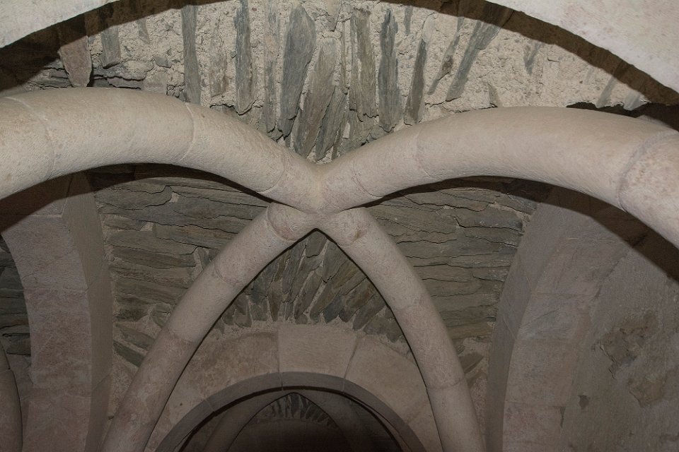 Chapiteau des colonnes de la galerie du cloitre La tribune  On distingue un pilastre à gauche et à droite et des colonnes jumelées au centre Voutes de la tribune  Les voutes reosent sur des colonnes en marbre rouge Voutes de la tribune  Les voutes de la tribune sont des voutes d'arête en schiste, les ogives en pierre ne servent que de couvre joint décoratif