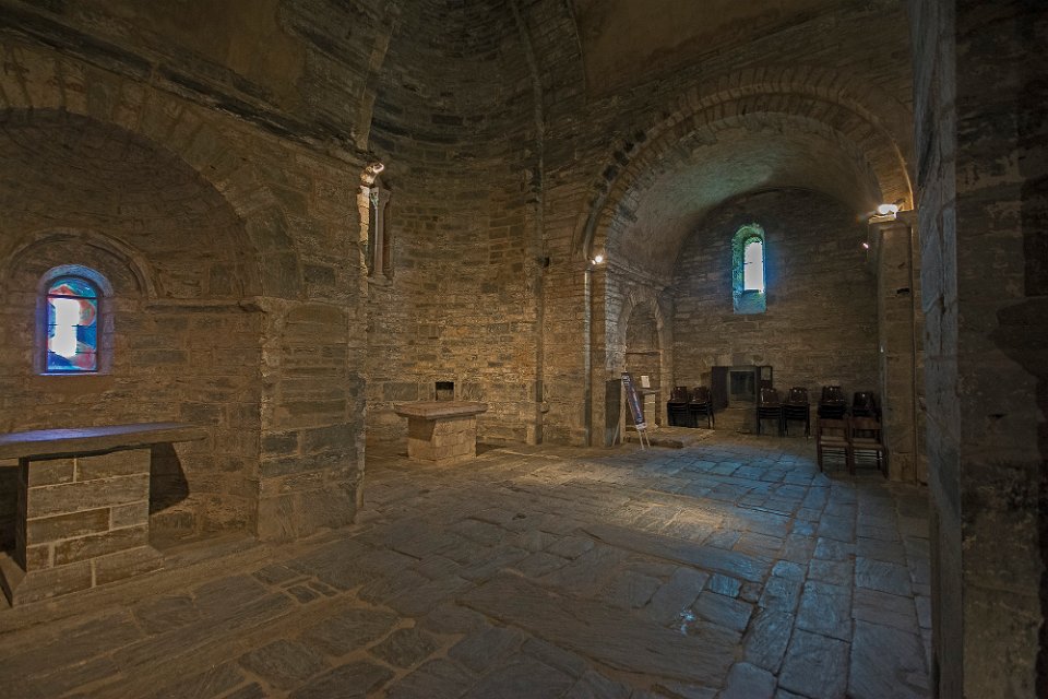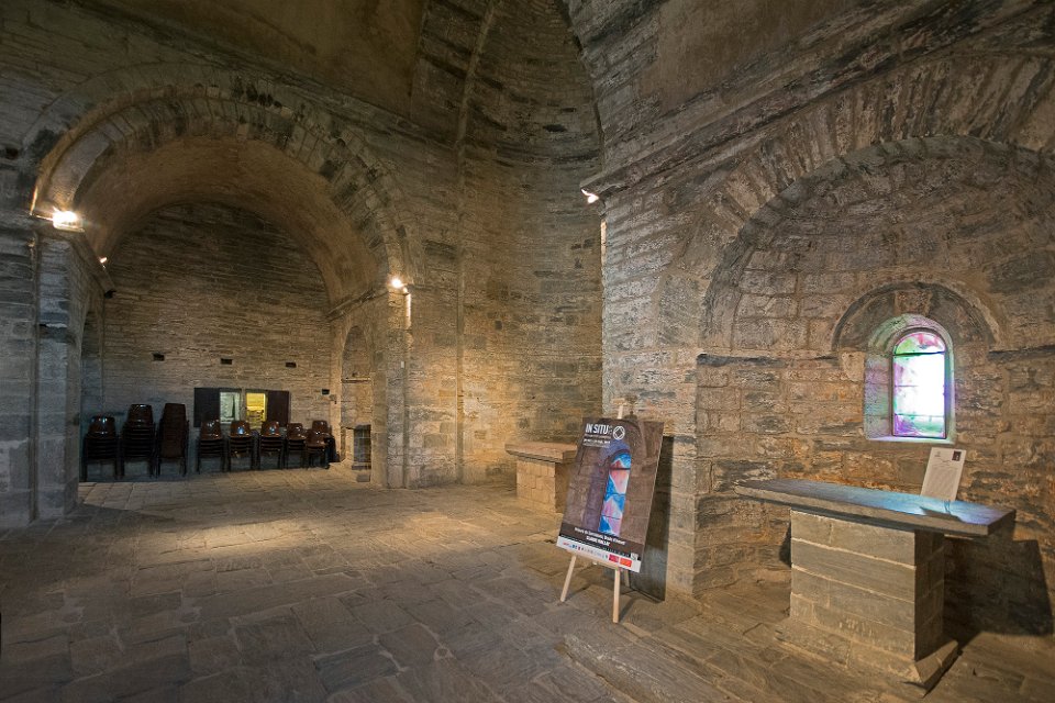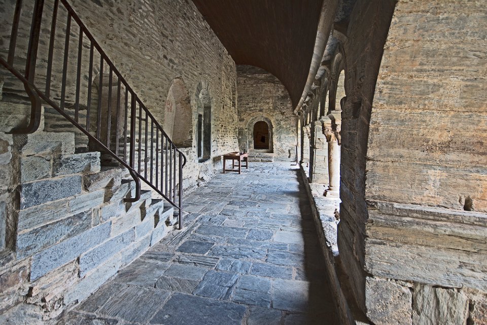 Galerie du cloitre vue de l'extérieur Intérieur de l'église  Dans chaque bras de la nef  est aménagée une absidiole voûtée en cul-de-four. Intérieur de l'église Galerie du cloitre  Au fond la porte qui conduit à la salle capitulaire