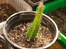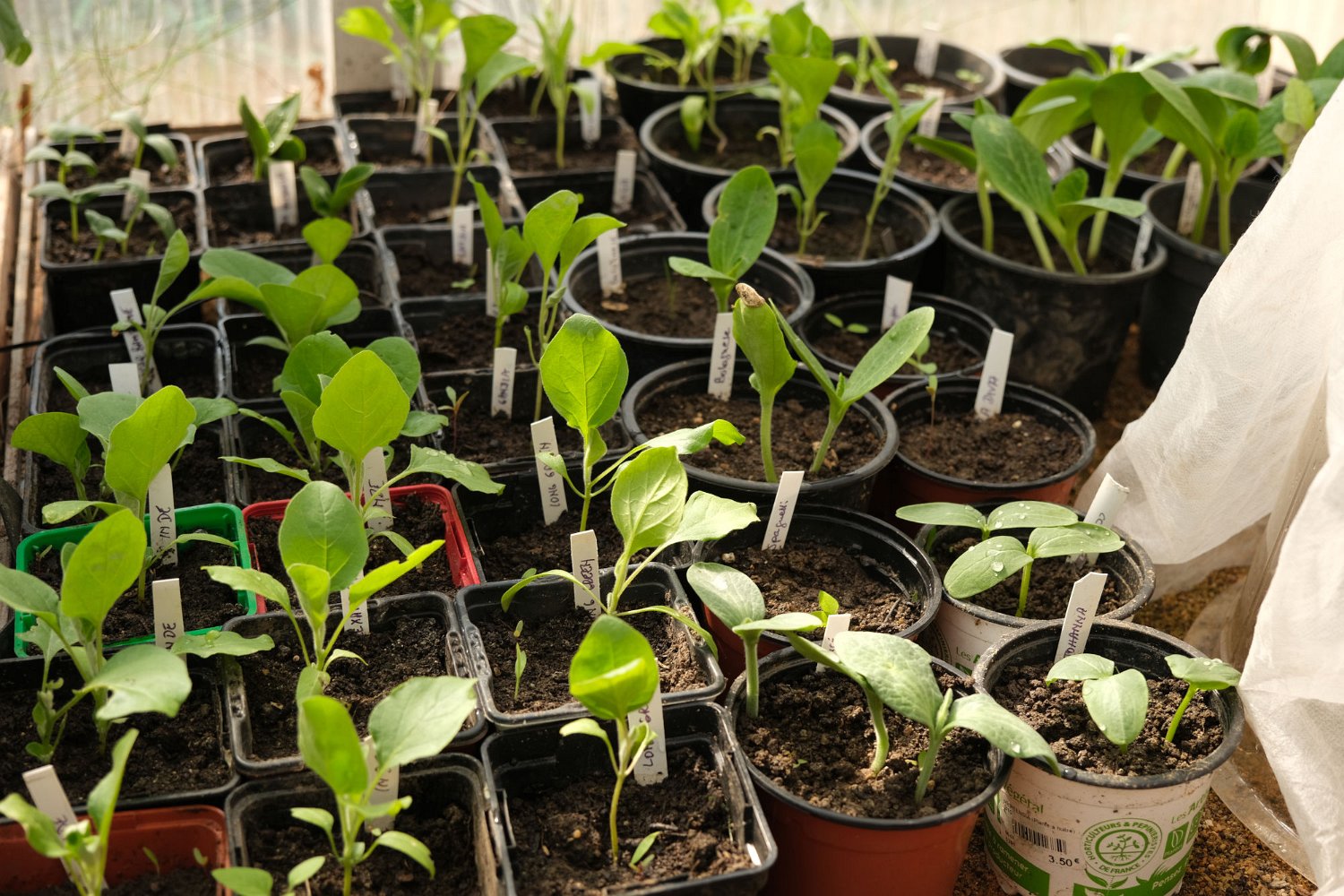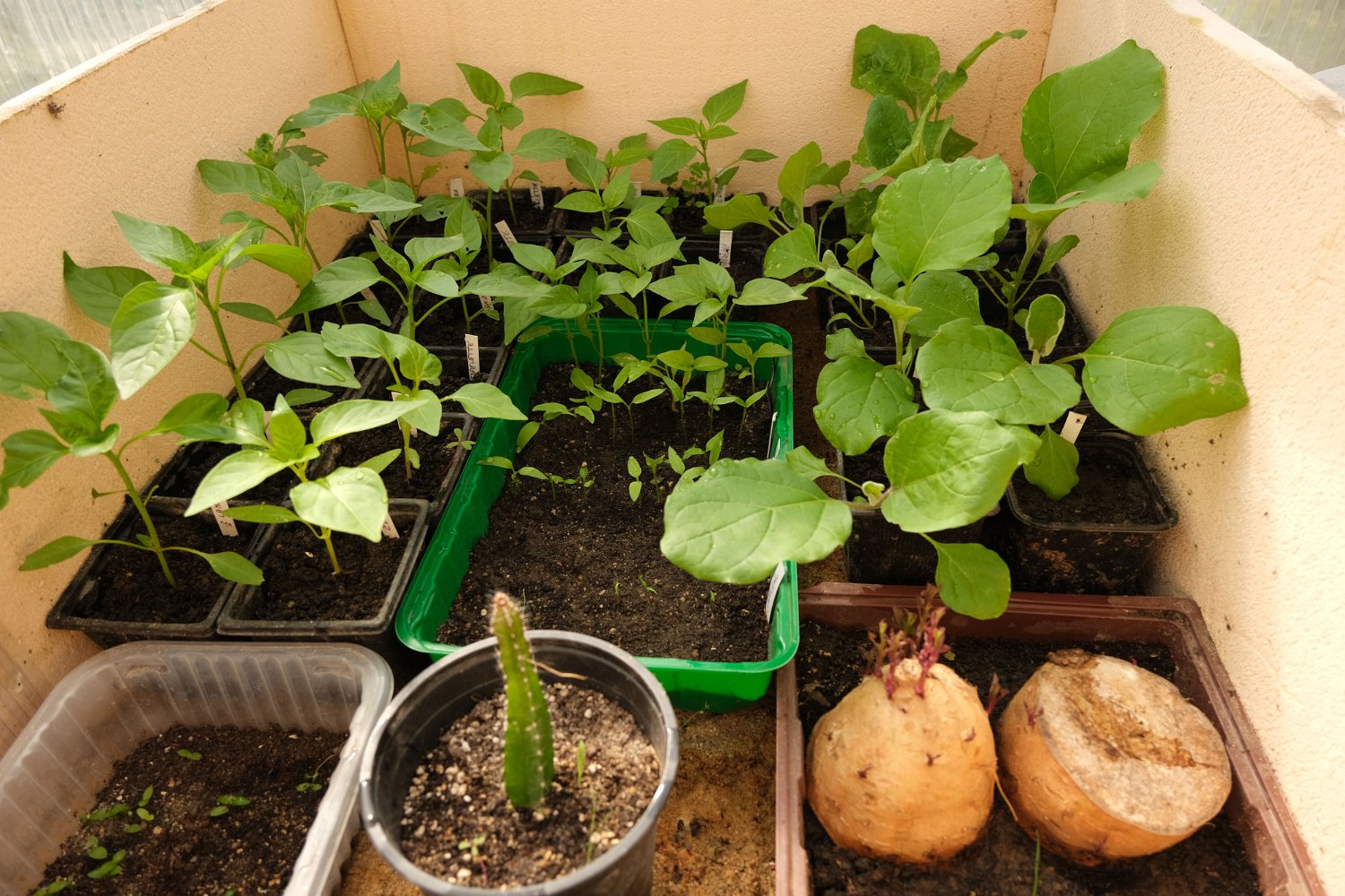 Plants de poivrons et d'aubergine. Au 1er plan le cactus est un pitaya (fruit du dragon) et à côté une patate douce en cours de germination