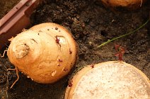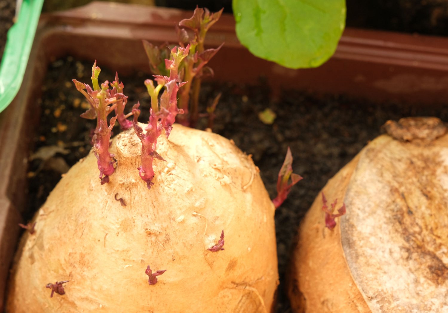 Les tranches de patate douce sont simplement posées sur du terreau maintenu humide. Les rejets seront coupés et mis à raciner dès qu'ils atteindront 10cm…