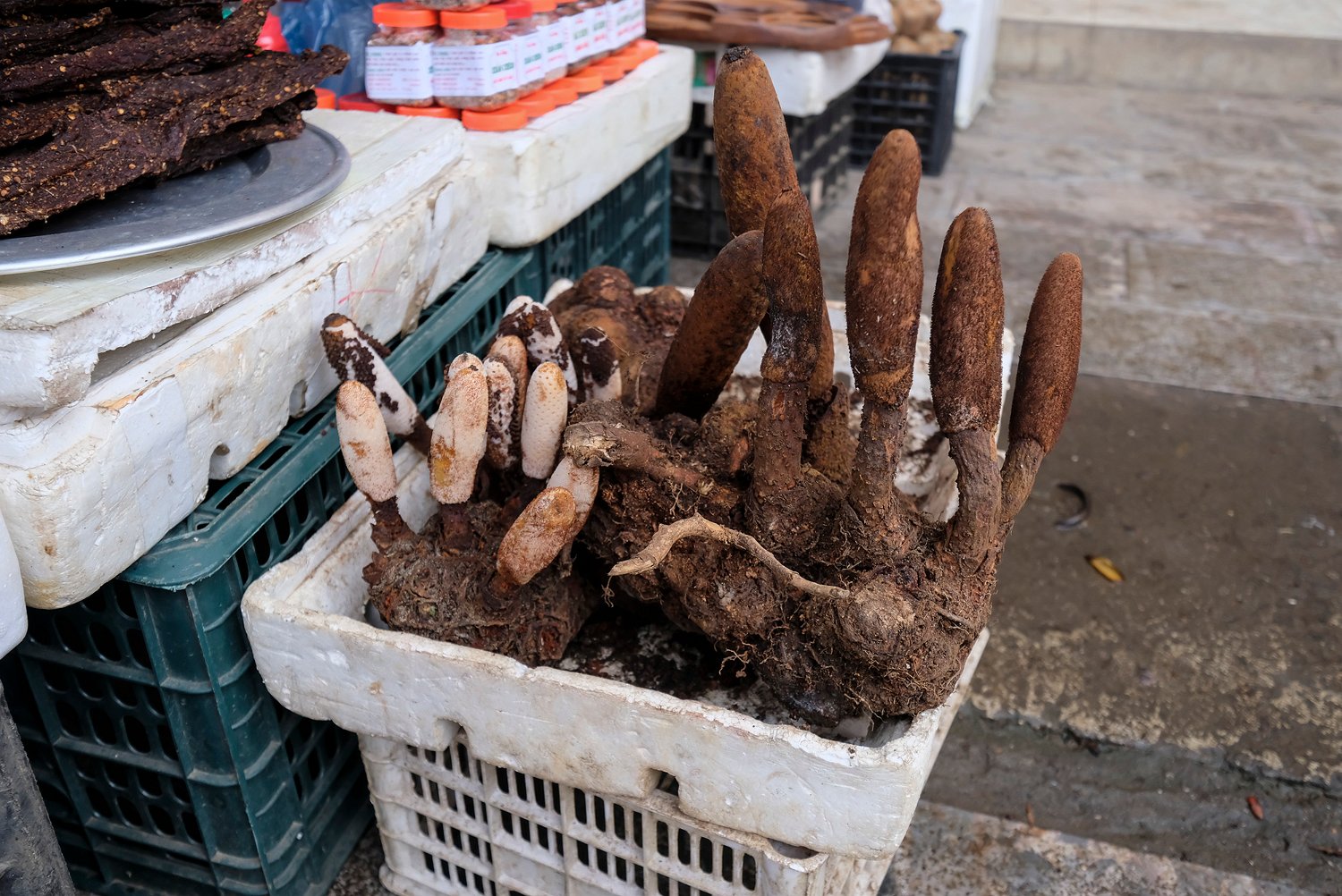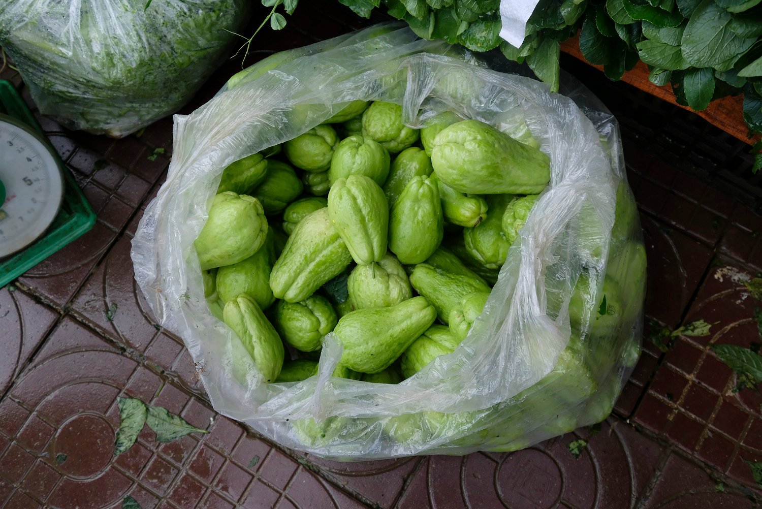 Champignon local non identifié La marché s'étend à l'extérieur du bâtiment Vente de fruits à l'extérieur du marché La chayotte est LE produit local de la région de Sapa. Les collines environnantes en sont couvertes